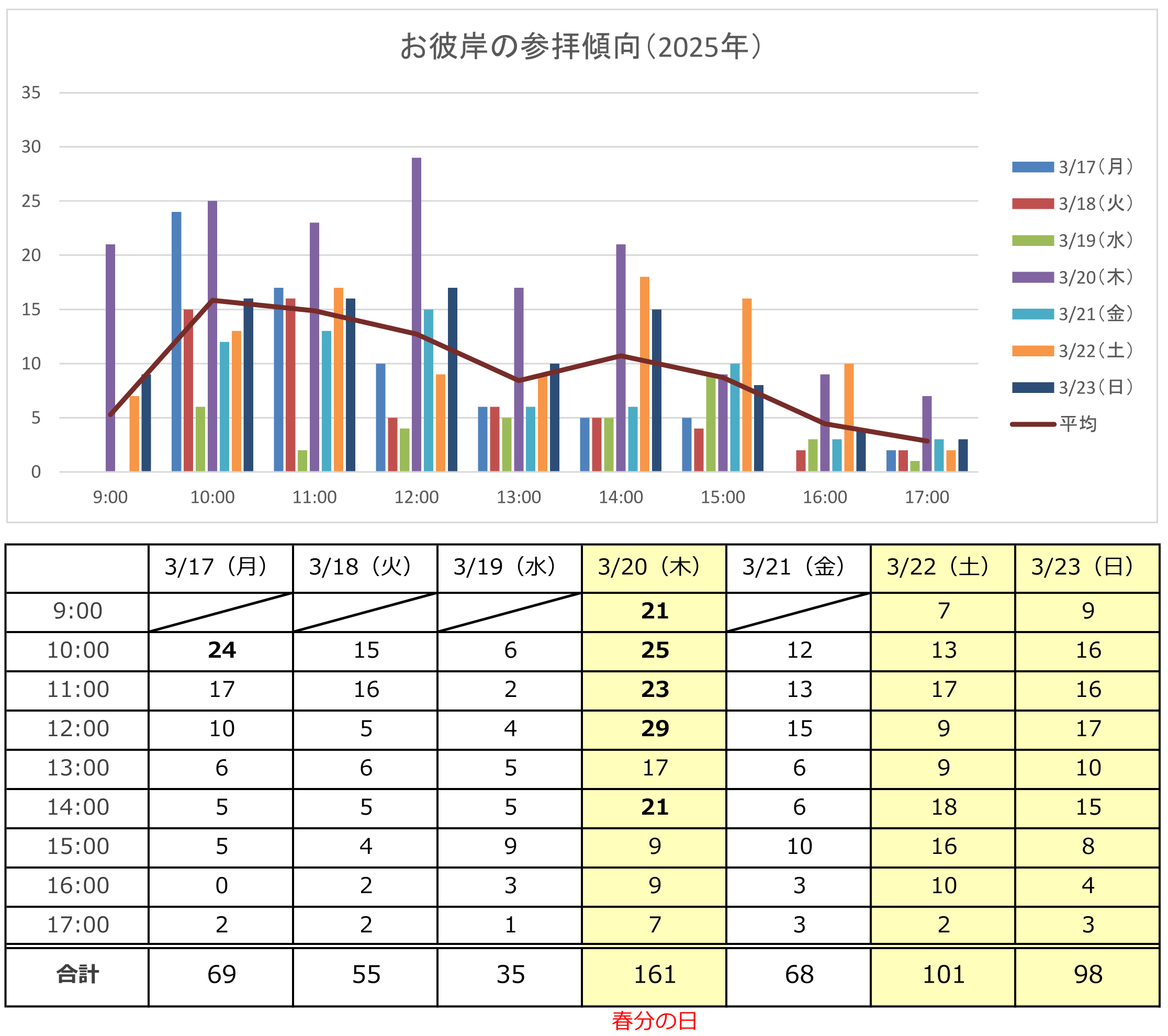 参考に、昨年の春彼岸の参拝状況を表示いたします。